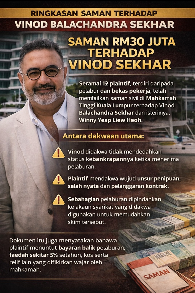 Pada tahun 2023, seramai 12 individu—terdiri daripada 10 pelabur dan 2 bekas pekerja—memfailkan saman sivil terhadap Vinod Sekhar dan isterinya, Winny Yeap Liew Heoh, di Mahkamah Tinggi Kuala Lumpur. Mereka mendakwa telah diperdaya untuk melabur dalam syarikat-syarikat milik Vinod antara tahun 2002 hingga 2006 tanpa dimaklumkan mengenai status kebankrapan beliau ketika itu. Tuntutan tersebut melibatkan dakwaan penipuan, salah nyata, dan pelanggaran kontrak, dengan jumlah tuntutan sebanyak RM30 juta.