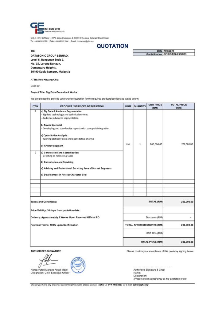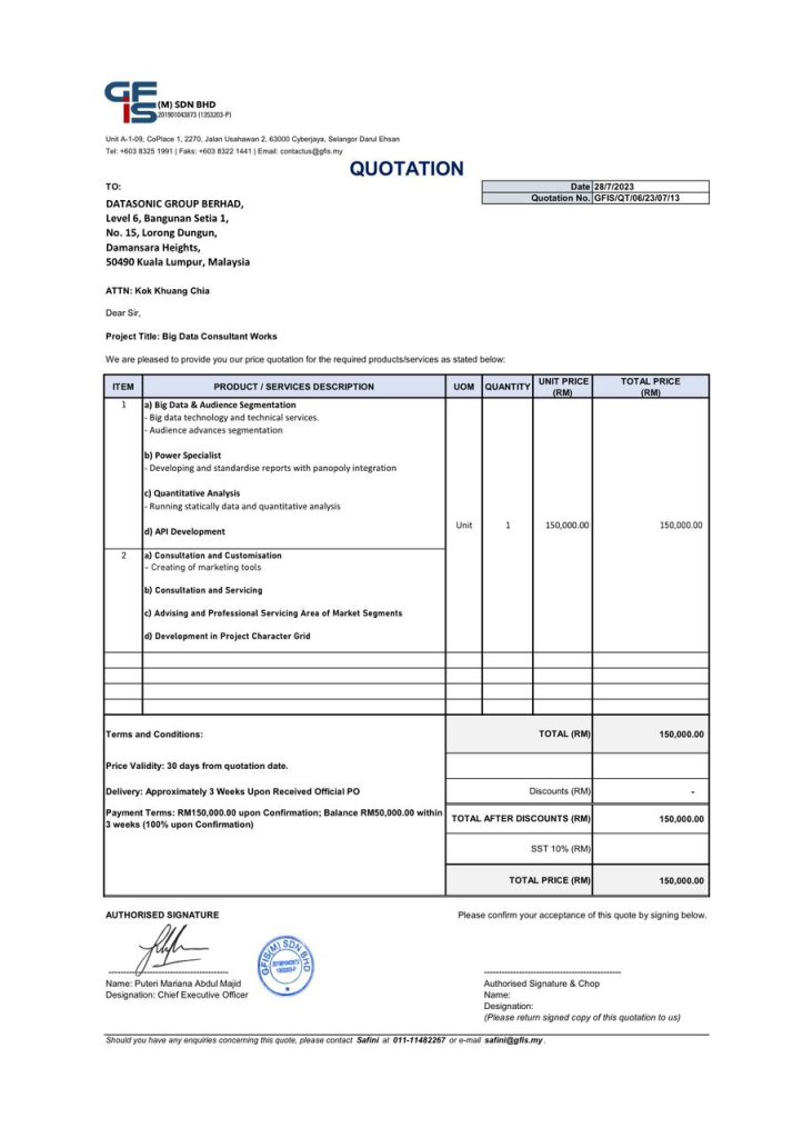 Siasat pengarah syarikat GFIS (M) Sdn Bhd Puteri Mariana Abdul Majid dan Muhammad Hishamuddin Hasan bersekongkol mencipta projek palsu daripada Datasonic. Siasat transaksi bank RM200,000 GFIS (M) Sdn Bhd ke mana duit itu dibelanjakan?.