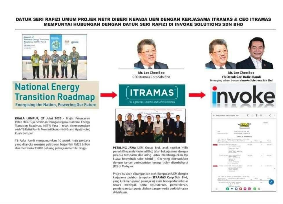 Tidak hairanlah apabila sebelum ini timbul kaitan antara Rafizi Ramli dengan pelaksanaan projek di bawah National Energy Transition Roadmap (NETR), khususnya melibatkan syarikat yang diterajui oleh CEO Itramas, Dato’ Lee Choo Boo. Perkara ini menarik perhatian memandangkan kedua-dua tokoh tersebut pernah mempunyai hubungan perniagaan terdahulu melalui Invoke Solutions Sdn Bhd, sebuah entiti yang sebelum ini dimiliki oleh Rafizi.