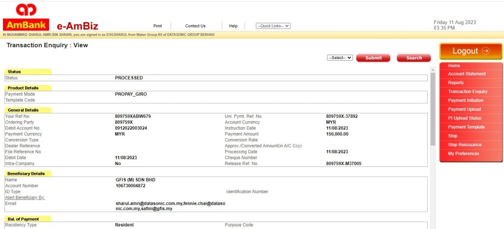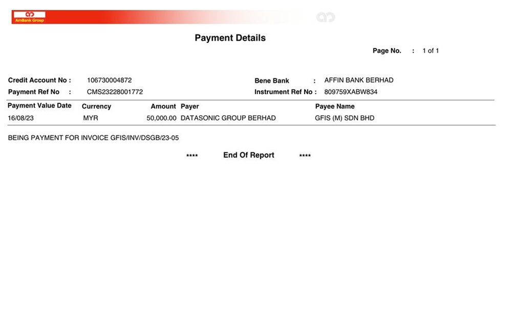 Dato’ Abu Hanifah mengarahkan  Datasonic membayar RM150,000 kepada Mohd Harizan bagi menyokong aktiviti politik berkaitan Rafizi. Bukti transaksi bank pada 11 Ogos 2023.