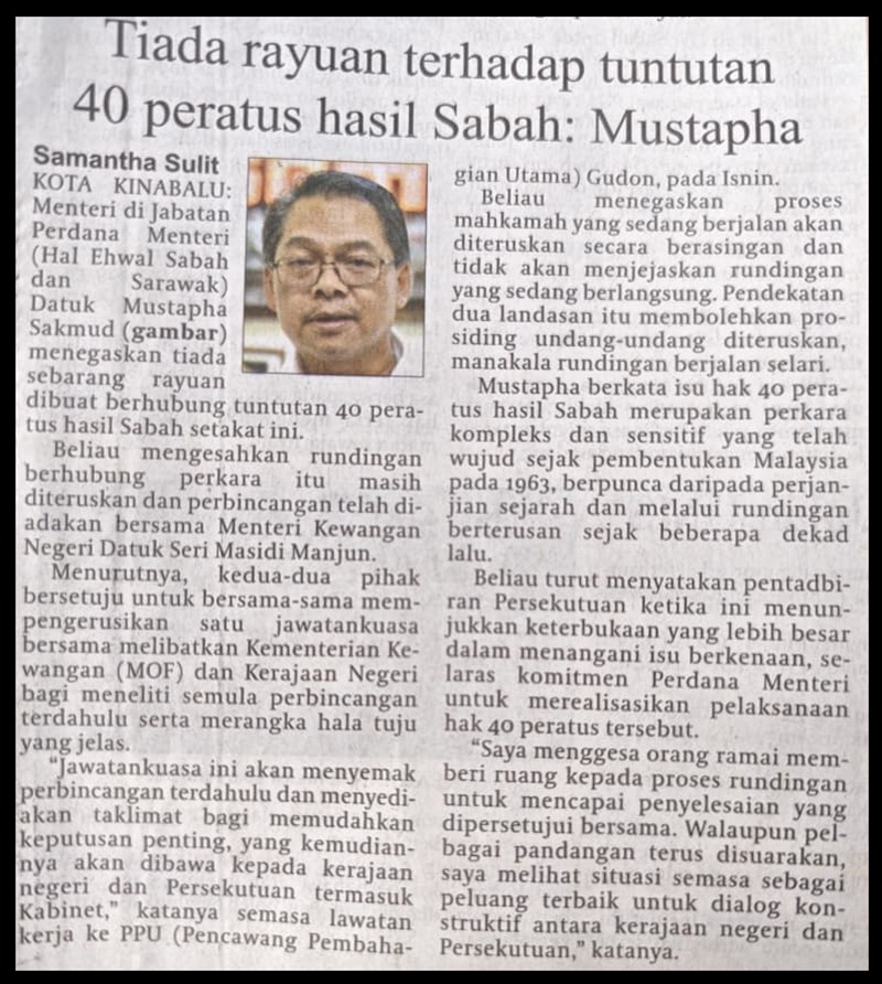 Jadi kenyataan media Datuk Mustapha Sakmud Menteri Jabatan Perdana Menteri (Hal Ehwal Sabah dan Sarawak) tiada salahnya. Ia bukan satu cara mengelirukan rakyat. Ia memperakukan tuntutan 40 peratus yang sedang beliau laksanakan selaku Menteri berkaitan.